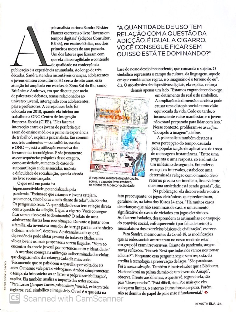 Matéria publicada na revista Ela do Jornal O Globo, em 3 de janeiro de 2021, com o título Qual a hora de parar?, traz uma breve visão da psicanalista Sandra Niskier Flanzer sobre as consequências psíquicas do uso excessivo de telas – em especial em jogos e redes sociais – na vida dos adolescentes brasileiros.
